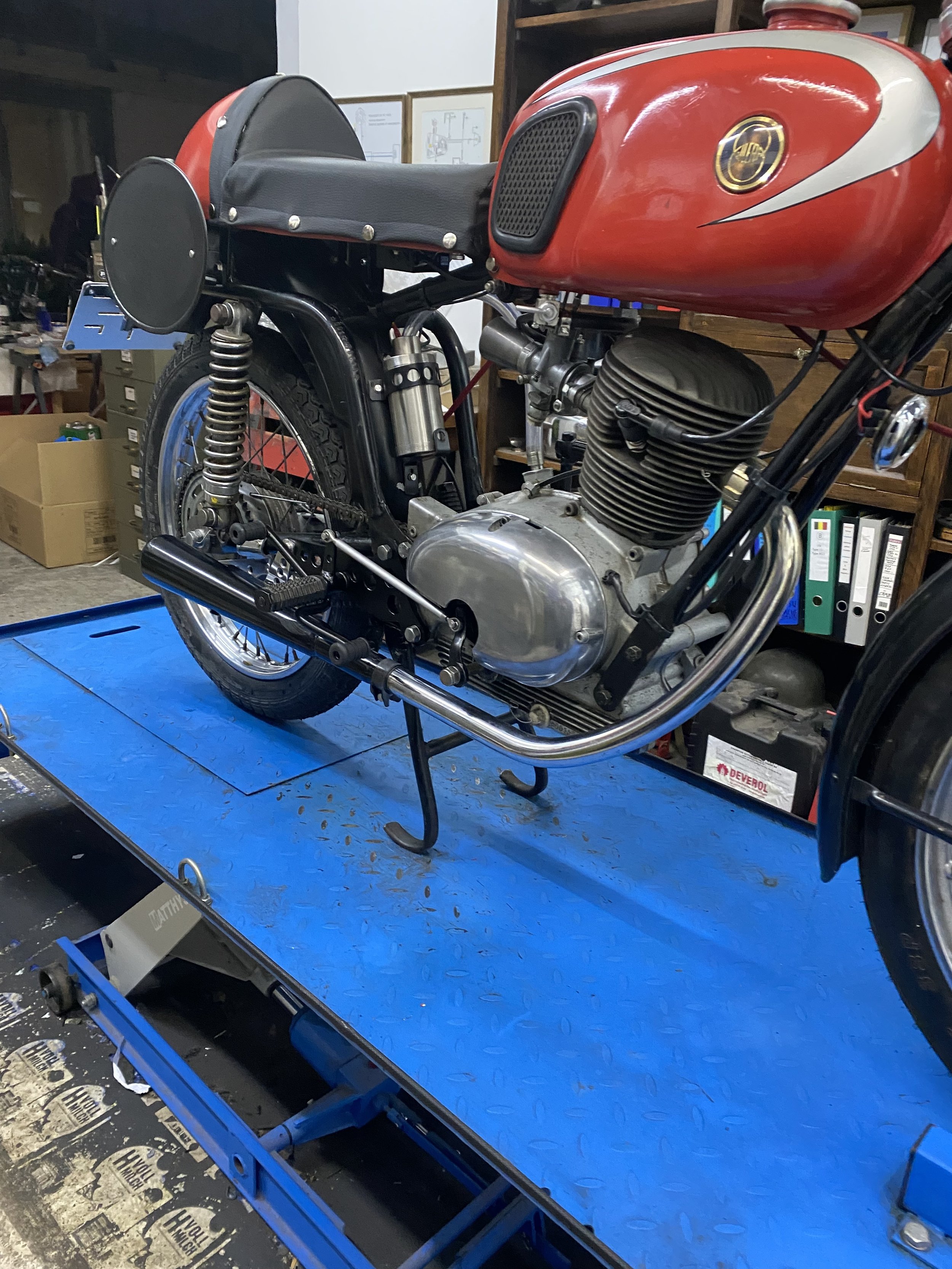 De hele motorfiets werd ook wedstrijdklaar gemaakt: wiel-assen, remonderdelen, olie- af en inlaat met RVS-veiligheidsdraad geborgd. Bowden-kabels op maat gemaakt. Deze fiets zal zonder aanmerking de veiligheidscontrole van Europese oldtimer-wedstrijden doorlopen!